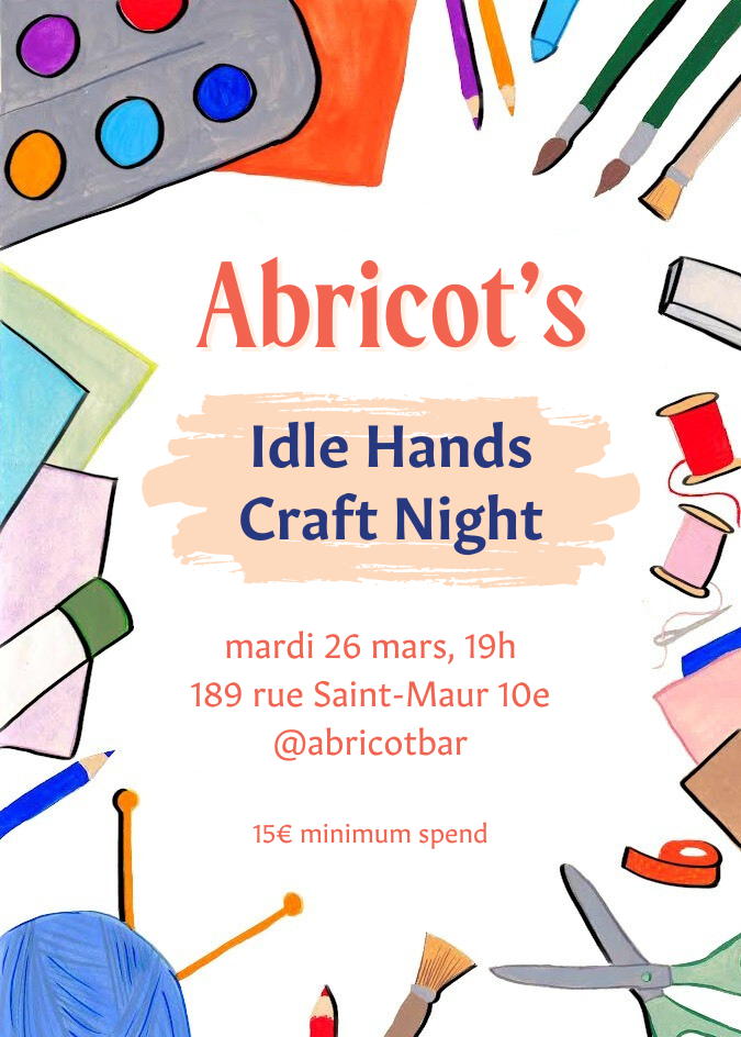 Idle Hands Craft Night Thursday, June 13, 2024 7:00 PM 10:00 PM Abricot 189 Rue Saint-Maur Paris, IDF, 75010 France (map) Google Calendar ICS Looking to work on that crochet or embroidery project, or sketch a still life of a killer cocktail? Join us for Idle Hands, a community craft night hosted by Hannah Steinkopf-Frank!